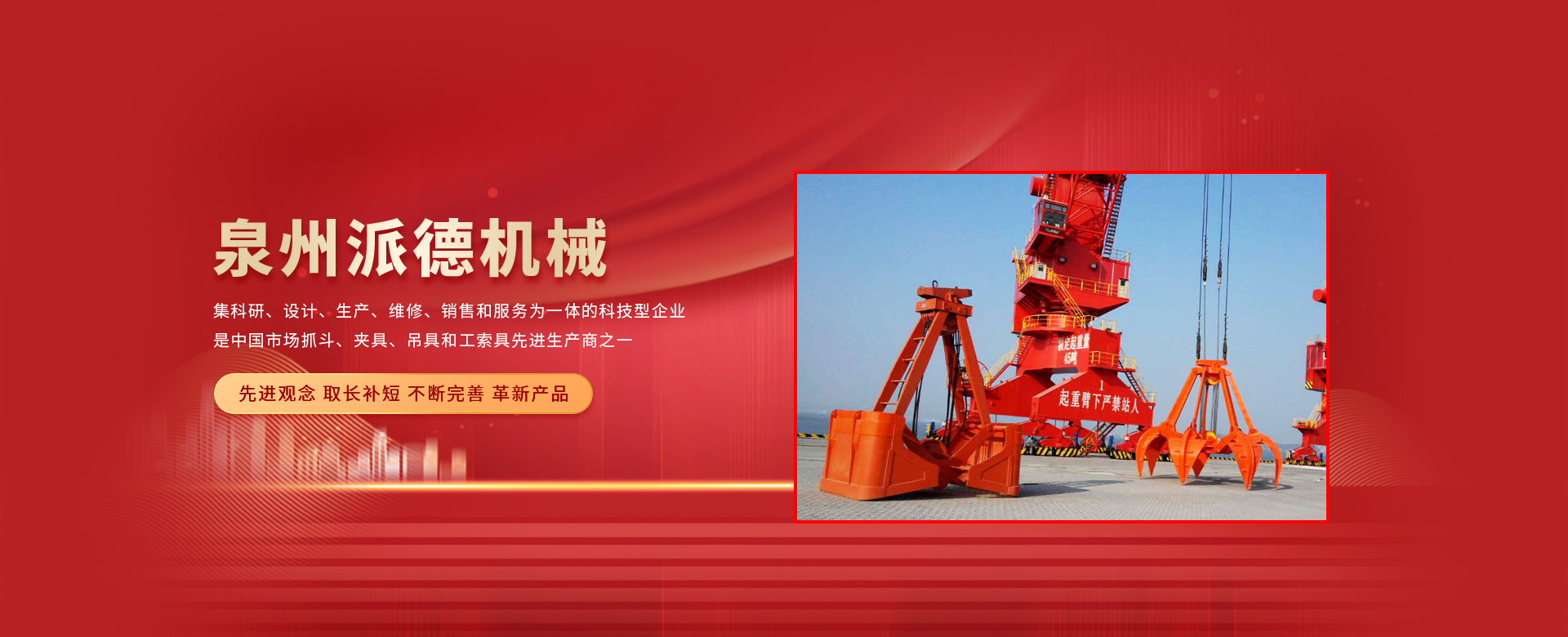 泉州派德機械有限公司成立於(yú)2012年5月,位於全國文明的古城福建泉(quán)州(zhōu),公(gōng)司擁有各類(lèi)型專業員工(gōng)82人,其中高級工程師1人,工程師4人(rén),助理工程師5人,是一家集科研、設(shè)計、生產、維修、銷售和服務(wù)為一體(tǐ)的(de)科技型企業,是中國市場抓鬥、夾具、吊具和(hé)工索具先進生產商之一。產品(pǐn)采用國(guó)內外先進的設計方案、技術規範(fàn)、製造過程、工藝流(liú)程和服(fú)務,憑借在抓鬥、夾具、吊具(jù)和工索具領域的超(chāo)前設計理念和成熟的技術、工藝和管理,在(zài)抓具領(lǐng)域迅速崛起(qǐ)。